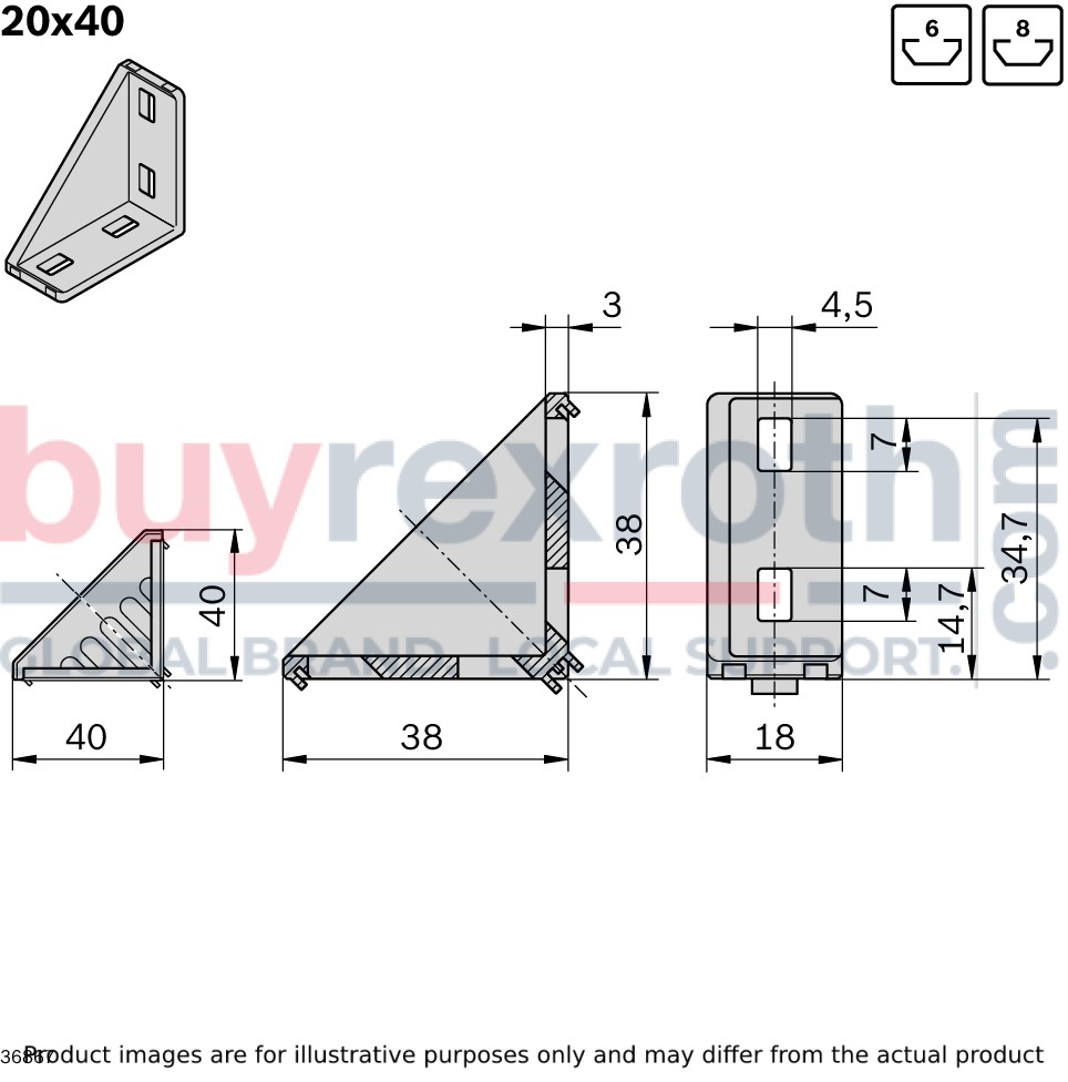 The Bosch Rexroth GUSSET 20X40 SET (3842523520) is a robust and versatile bracket set designed for precise and rapid assembly within various structural applications. This set includes brackets featuring centering lugs that ensure accurate alignment and protection against rotation, facilitating a quick and secure connection. For instances where the standard centering feature is not required, these lugs can be conveniently broken off, allowing the brackets to be used on flat surfaces or at right angles to the profile slot.
