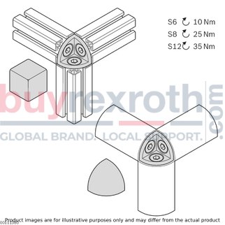 The Bosch Rexroth CAP COVER K30X30ESD (3842548713) is a specialized component designed to enhance the functionality and safety of profile systems. This cover cap is specifically tailored for corner connections, suitable for both square and half-round profiles with equal cross-sections. Its primary application is to provide a protective covering over the corner brackets, mitigating the risk of injury while also preventing the accumulation of dirt and debris within the bracket itself.