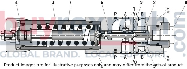 This model includes options for different spool symbols (P to P) and offers various adjustment types such as a rotary knob or sleeve with hexagon and protective cap. It also has an option for a lockable rotary knob with scale. The valve can be configured for pressure reduction in channel A, B or channel P and includes an optional check valve for version A only. The corrosion-protected design ensures durability in harsh environments.