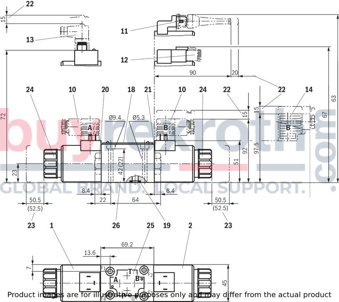 For valves with connector “K4” according to EN 175301-803 and ISO 4400, 2-pole + PE, “large cubic connector” Mating connectors for valves with one or two solenoids (individual connection)Data sheet