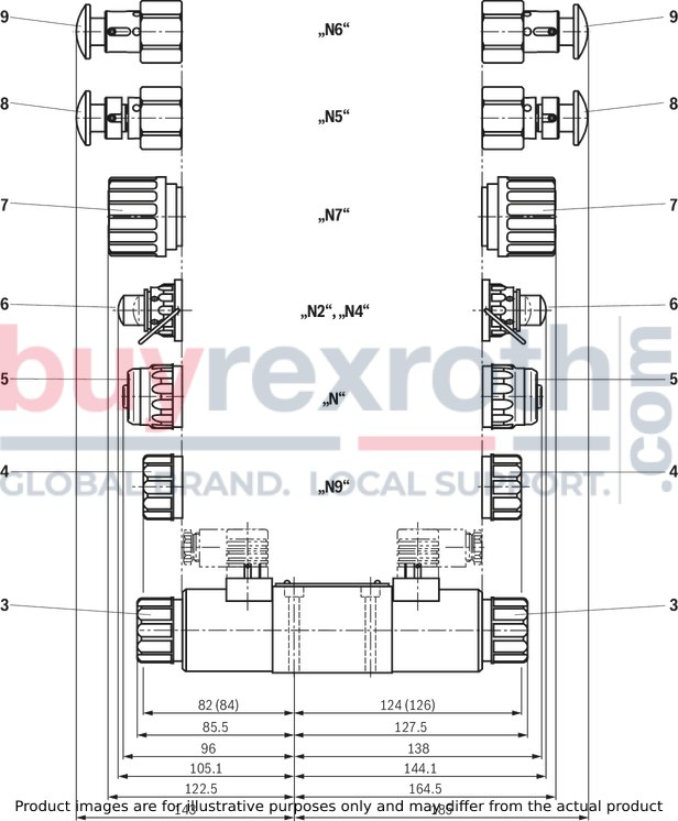 Porting pattern according toISO 4401-03-02-0-05 (with locating hole for locking pin ISO 8752-3x8-St, material no. R900005694, separate order) |