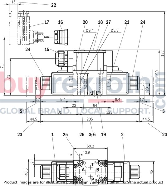 The Bosch Rexroth 4WE6E6X/EG205N9K4 valve has been designed with a number of user-friendly features such as an optional auxiliary actuation for manual control without magnet supply and the possibility for spool position monitoring. The high-power solenoid can be rotated by 90 degrees if required and offers both single and central electric connections.