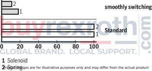 The composition of the control spools and solenoids greatly reduces the number of switching strokes that occur when the valves are switched on or off. The switching strokes, measured as acceleration values a, can be reduced by approx. 85 % compared to the standard valve, depending on the version of the control spool (see “Acceleration values”).