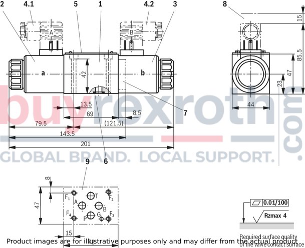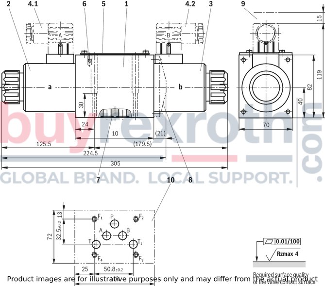 The 4WRA10EB60-2X/G24N9K4/V features a robust housing that includes a connection surface and a control spool balanced by compression springs. The solenoids facilitate direct operation of the control spool when energized, allowing for proportional displacement to the left or right in response to an electric input signal. This results in progressive flow characteristics through orifice-type cross-sections, connecting from P to A and B to T. When deenergized, the springs automatically return the control spool to its central position.