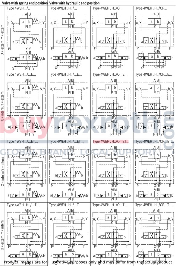 Types of actuation (internal or external pilot control): Electro-hydraulic (type WEH) For subplate mounting Porting pattern according toISO 4401 4/3-, 4/2- or 3/2-way version Spring or pressure centering, spring end position or hydraulic end position Wet-pin DC or AC solenoids, optional Electrical connection as individual or central connection Optional versions: