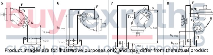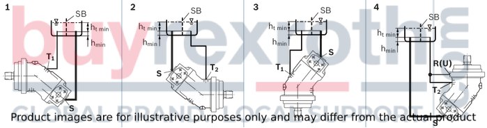 During commissioning and operation, the axial piston unit must be filled with hydraulic fluid and air bled. This must also be observed following a relatively long standstill as the axial piston unit may drain back to the reservoir via the hydraulic lines. Particularly in the installation position "drive shaft upwards" filling and air bleeding must be carried out completely as there is, for example, a danger of dry running. The case drain fluid in the housing must be directed to the reservoir via the highest available drain port (T1,T2). If a shared drain line is used for several units, make sure that the respective case pressure is not exceeded. The shared drain line must be dimensioned to ensure that the maximum permissible case pressure of all connected units is not exceeded in any operating conditions, specifically on cold start. If this is not possible, separate reservoir lines must be laid as required. To achieve favorable noise values, all connecting lines should be decoupled by using elastic elements and above-reservoir installation is to be avoided. In all operating conditions, the suction and drain lines must lead into the reservoir below the minimum fluid level. The permissible suction height hS results from the overall loss of pressure; it must not, however, be higher than hS max = 800 mm. The minimum suction pressure at port S must also not fall below 0,8 bar absolute during operation and during cold start. When designing the reservoir, ensure adequate space between the suction line and the drain line.This provides a slow-down and desgasification of the fluid and prevents that heated return flow is being drawn directly back into the suction line.Installation position