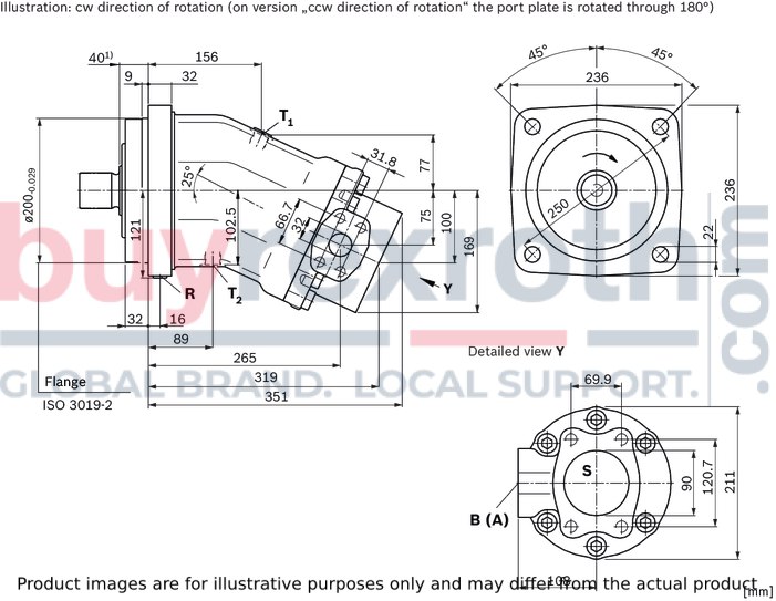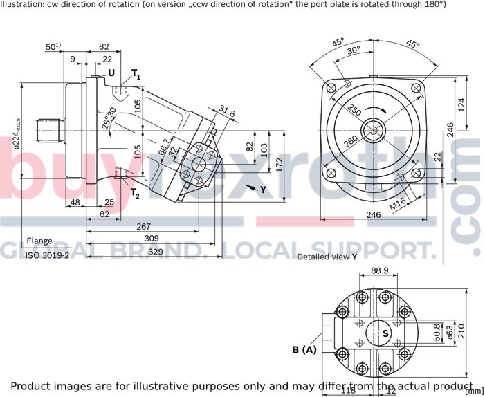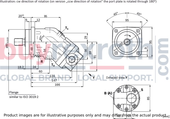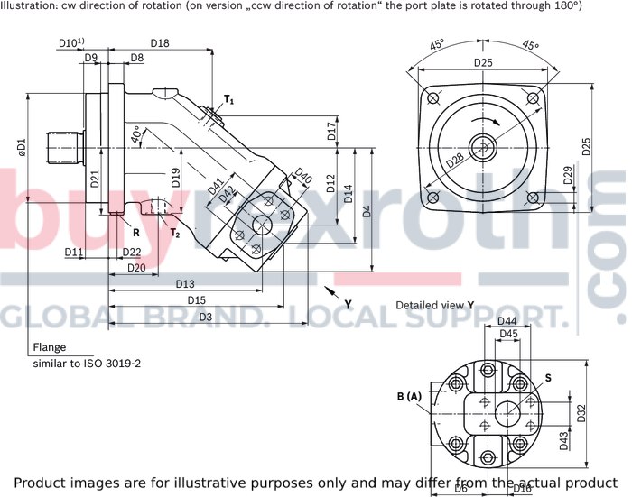 The axial piston unit is designed to be used in open circuits. The project planning, installation and commissioning of the axial piston unit require the involvement of qualified skilled personnel. Before using the axial piston unit, please read the corresponding instruction manual completely and thoroughly. If necessary, request it from Bosch Rexroth. Before finalizing your design, request a binding installation drawing. The specified datas and notes must be observed. Preservation: Our axial piston units are supplied as standard with preservative protection for a maximum of 12 months. If longer preservative protection is required (maximum 24 months), please specify this in plain text when placing your order. The preservation times are valid under optimal storage conditions. Details of these conditions can be found in the data sheet 90312 or the instruction manual. A pressure relief valve is to be provided in the hydraulic system. Observe the instructions in the instruction manual regarding tightening torques of connection threads and other threaded joints used. The notes in the instruction manual on tightening torques of the port threads and other screw joints must be observed. The ports and fastening threads are designed for the permissible maximum pressure pmax (see instruction manual). The machine or system manufacturer must ensure that the connecting elements and lines correspond to the specified operating conditions (pressure, flow, hydraulic fluid, temperature) with the necessary safety factors. The working ports and function ports are designated only to accommodate hydraulic lines.During and shortly after operation, there is a risk of burns on the axial piston unit. Take appropriate safety measures (e.g. by wearing protective clothing).
