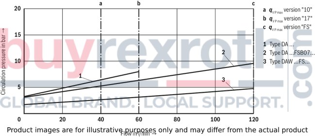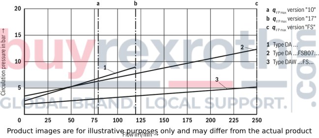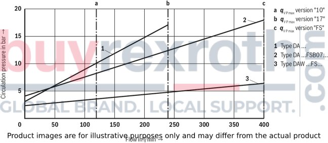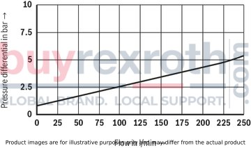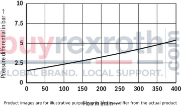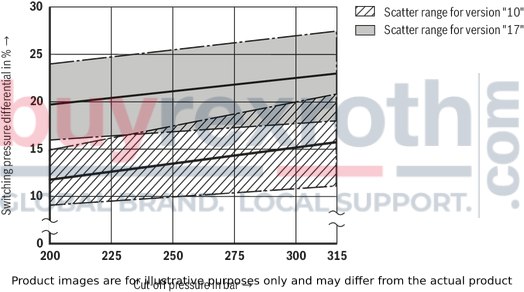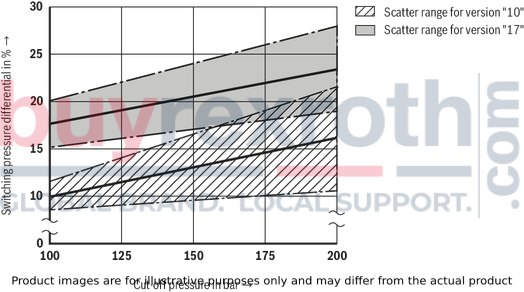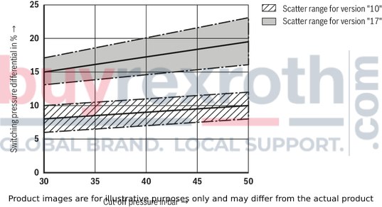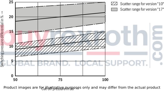 Different system conditions (particularly high pump and actuator flows) may lead to higher switching pressures than indicated in the characteristic curves. Here, the valve offers the possibility of optional adjustment of the switching pressure differential to the system.Type DA… (fixed switching pressure differential 10 % or 17 %)