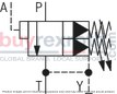 Switching of the pump flow from P to B to P to T.The pressure in channel P is applied via nozzles (5) and (9) to the spring-loaded side of the main spool (4) and at ball (17) in the pilot control valve (2). As soon as the cut-off pressure set at the adjustment spindle (12) is reached in the hydraulic system, the ball (17) opens against the spring (18). The hydraulic fluid now flows via nozzles (5) and (9) into the spring chamber (19) to the return line (10) to T (type DA ...) or externally via port Y (type DA ...Y). The main spool (4) is lifted from the seat and opens connection P to T. The check valve (7) closes the connection from P to A. Via the pilot spool (16), the actuator pressure A holds the ball in the pilot control valve (2) in open position.