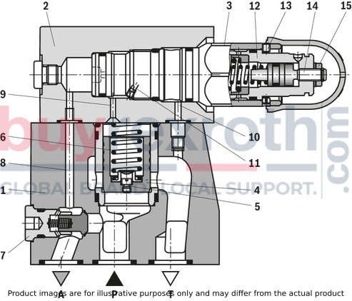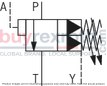 Only indirect pressure limiting function:A pressure limiting function of the pump pressure (to the tank) is not directly provided but only indirectly via the check valve (7), control line (8) and pilot control valve (2) to channel T.