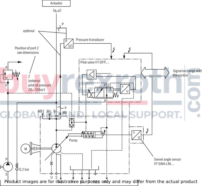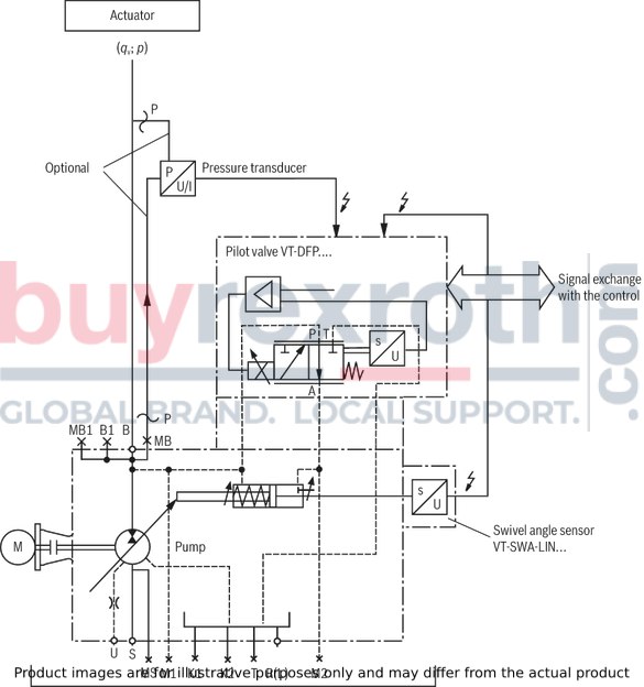The control system consists of the following components: A4VSO axial piston variable displacement pump optimized for the operation in the control system VT-DFPE-2X or VT-DFPD-1X proportional valve as pilot valve including inductive position transducer for valve position sensing. Position transducer for sensing the swivel angle Pressure transducer with suitable signal level and dynamics (optionally HM 20, separate order)