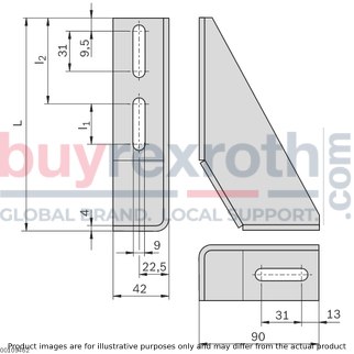 The Bosch Rexroth FOUNDATION BRACKET 210X90X42X4 (3842146848) is a robust and versatile component designed for securing frames to the floor, ensuring stability and rigidity in various applications. With its dimensions of 210mm in length, this foundation bracket is specifically engineered to offer reliable support without the need for profile finishing, simplifying installation and maintenance processes. The bracket features a pre-drilled hole that allows for the insertion of a floor dowel, facilitating an easy and efficient anchoring system. This feature also eliminates the need to remove the bracket when creating the dowel hole, further streamlining the setup procedure. Crafted with precision, this foundation bracket is an essential element for constructing stable structures in diverse settings where securing frames firmly to a base is crucial. Its straightforward design ensures compatibility with a variety of profiles, making it a handy solution for numerous assembly requirements. The Bosch Rexroth FOUNDATION BRACKET 210X90X42X4 (3842146848) represents durability and ease of use, making it an excellent choice for professionals seeking reliable fastening solutions.