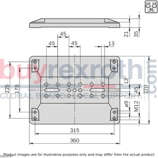 The Bosch Rexroth BASE PLATE (3842514567) is a robust and versatile foundation component designed for constructing supports for partition walls and protective walls within various settings. This base plate measures 270mm by 360mm, providing a substantial surface area to ensure stability and strength in the structures it supports. The design of the plate allows for secure anchoring with floor dowels, which enhances its reliability when installed in a construction environment.