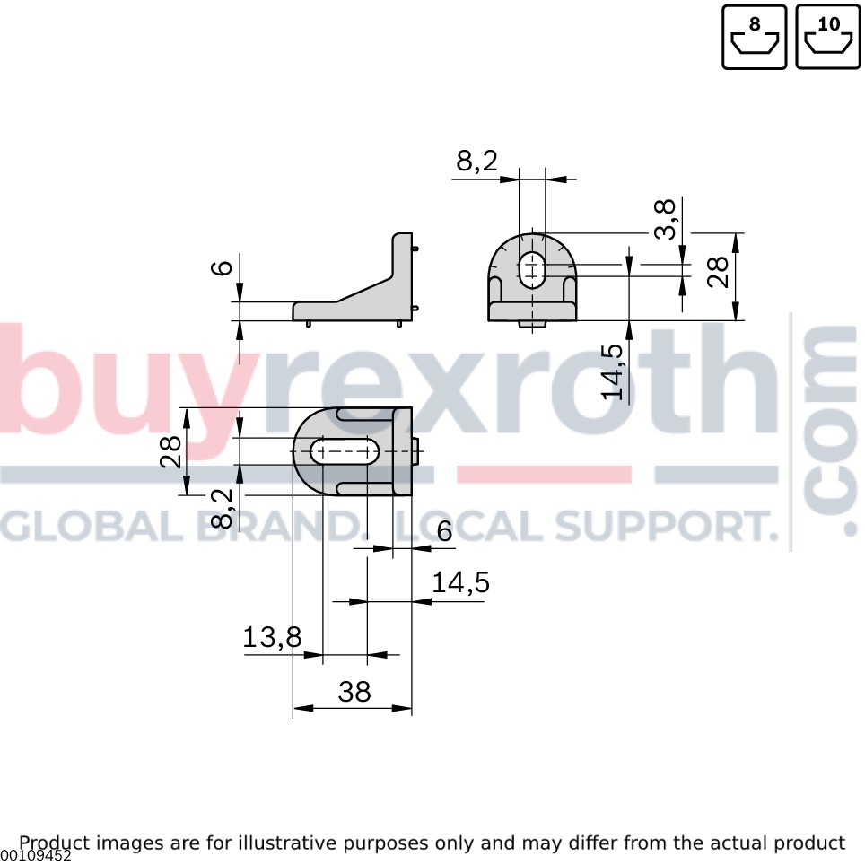 The Bosch Rexroth GUSSET R28X38 10-10 SET (3842521580) is a versatile and robust bracket designed for connecting profiles at any angle without creating obtruding edges, thanks to its rounded design. This particular model is part of the designLINE series, featuring a special silver paint finish in RAL 9006 that offers an elevated aesthetic quality to any assembly. The brackets come with centering lugs that ensure rapid and precise assembly while also providing protection against turning, contributing to a stable and secure connection. These centering lugs are also designed to be easily removable, allowing for straightforward assembly on plates or at right angles to the slot. The GUSSET R28X38 10-10 SET is engineered for convenience as it does not require profile finishing, which simplifies the installation process and saves time during assembly. Its compatibility with standard slot 10/10 profiles makes it a flexible solution for various structural applications where reliable bracket connections are essential.