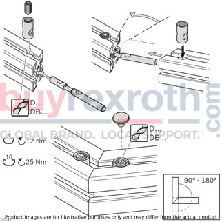 The Bosch Rexroth QUICK CONNECTOR 10-S/S (3842535634) is a versatile and robust component designed for the seamless end-to-end connection of two profiles with equal cross-sections. This quick connector is particularly useful for constructing frames and can be utilized to join profiles at any angle, providing flexibility in design and assembly. The model features options for profile finishing, including blind holes DB11, DB17 or through-holes D11, D17, as well as miter cuts, which allow for a clean and precise fit.