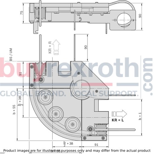 One key feature of this drive kit is its flexibility in terms of curve direction; it can be configured for either right (KR = R) or left (KR = L) curve direction, depending on the specific requirements of the application. The installation location AO denotes where on the curve—infeed or outfeed—the drive kit should be placed, which allows for precise setup and optimal function within various layouts.
