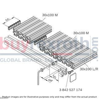 The Bosch Rexroth T-SLOT PLATE (3842542698) is a versatile and robust component designed for constructing experimental structures of any dimension. This modular plate profile features multiple slots with a spacing of 30 mm and a slot size of 8 mm, allowing for the use of 8 mm slot connectors. The grooved plate x M L design facilitates the assembly of grooved plates to any desired width, while the inclusion of a lateral 10 mm slot in the Grooved plate x LR variant serves as an outer stop.