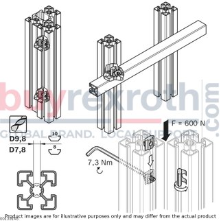 The Bosch Rexroth PARALLEL CONNECTOR 8 (3842542737) is a robust and versatile component designed for the seamless connection of two strut profiles. Whether users need to join profiles parallel to the axis or at any angle, this parallel connector ensures a gap-free and aesthetically pleasing interior connection, making it an ideal solution for constructing material shelves or various framework applications. The connector is comprised of two sliding blocks, each equipped with welded springs that facilitate simple and quick assembly. This design allows for connections to be made at any position along the profile. With the ability to transfer a significant displacement force per parallel connector, this component demonstrates its reliability in maintaining structural integrity under load. The product is crafted from steel with a galvanized finish, ensuring durability and resistance to corrosion. It also features through-hole profile finishing for additional stability in connected structures. The scope of delivery includes everything needed for installation: a sliding block with spring, a swivel-in sliding block with spring, and a countersunk screw M6. The sliding block's material information indicates that it is made of galvanized steel while the spring is constructed from stainless spring steel, which contributes to the overall longevity and performance of the connector. The PARALLEL CONNECTOR 8's dimensions include length (l) and diameter (D), which are specified according to the requirements of individual applications. Sold as part of Bosch Rexroth's product group ID, this parallel connector comes in specific packaging units designed for efficient handling and inventory management. With its robust construction and easy-to-use design, this component is an essential part of constructing versatile modular systems using Bosch Rexroth's aluminum strut profiles.