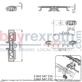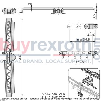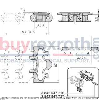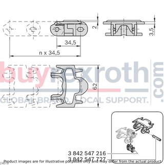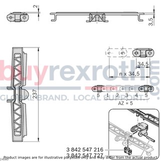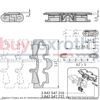 The Bosch Rexroth CHAIN LINK 120+ FRICTION (3842546008) is a specialized component designed for the VFplus static friction chain systems that are used to transport products on inclined conveyor sections. This particular chain link is engineered to enable the movement of items on both ascending and descending pathways, with the capacity to handle gradients up to a specific degree which depends on various factors such as product surface, section length, and conveyor speed. Users have the flexibility to determine the number of chain links with static friction lining based on the size and weight of the product being transported as well as the incline. The CHAIN LINK 120+ FRICTION features a large-area static friction lining that ensures secure transport of products, making it particularly effective for dry operation environments. From size 120 onwards, the chain plate is designed for easy replacement, enhancing maintenance efficiency. It's important to note that this chain link is not intended for accumulation operation or for transporting sharp-edged objects due to its specific coating. The design also boasts extremely quiet running thanks to its patented construction. For optimal performance and grip maintenance, regular cleaning of the chain link is recommended. The material used in manufacturing this component meets EU Regulation 10/2011 and FDA CFR 21 standards, ensuring safe contact with food products if necessary. It requires accessories such as a chain pin and jointed bolts for assembly. In terms of specifications, this model offers a maximum tensile force capacity of N (newtons) and comes in sizes ranging from , , , , , . Its low-vibration feature facilitates smooth transport and potential accumulation operation of small parts when combined with covered chain links. Overall, Bosch Rexroth's CHAIN LINK 120+ FRICTION represents a reliable solution for enhancing conveyor system functionality on inclined paths within dry operational settings.