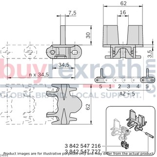 The Bosch Rexroth CHAIN LINK 90+ CLEATED (3842546016) is a specialized component designed for use with the VFplus conveyor systems. This chain link is engineered to facilitate the movement of products on conveyors with ascending or descending sections, ensuring a smooth transition and effective handling of materials. Constructed from POM material, it is durable and meets both EU and FDA CFR requirements for safety and quality.