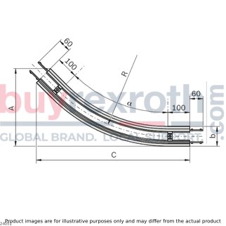 The Bosch Rexroth CURVE 90+ HOR AL 30? R700 (3842547077) is a high-quality component designed for facilitating a horizontal change in the direction of conveyor chains. It is an ideal solution for systems where space constraints make it impractical to use a curve wheel or where product dimensions and speeds necessitate an alternative method for directional change. This sliding curve is also beneficial in scenarios that require noise reduction during high-speed operations or when handling lengthy products on wedge conveyors. The CURVE 90+ HOR AL 30? R700 features an effective sliding rail length and actual chain length that can be specified according to the needs of the application. It has been designed with a deflection angle that accommodates various conveying situations. The profile of the sliding curve is made from anodized aluminum, ensuring durability and resistance to corrosion, while the profile connector is constructed from galvanized steel, and the cross connector from die-cast aluminum, offering robustness and longevity. This model comes fully assembled, including all necessary fastening materials for mounting to the AL section profile. Its design increases chain tensile force due to friction, which may lead to more effective handling of products on the conveyor system. The CURVE 90+ HOR AL 30? R700 can extend a curve wheel into a drive or alpine conveyor system, and its low-friction curve technology contributes to longer service life with reduced downtimes. Additional versions of this sliding curve can be requested through Bosch Rexroth's modification department. It requires Advanced or Premium slide rails for operation and supports all suitable chain types within its specified dimensions and deflection angles. With its open section profiles, this model ensures flexibility in application while providing reliable performance in various conveyor setups.