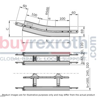 The Bosch Rexroth CURVE 320+ VERT AL 75?R500 (3842547108) is a meticulously engineered vertical curve component designed for use in conveyor systems. This model serves as a critical transition point, allowing for seamless integration between horizontal and ascending conveyor sections. The deflection angle facilitates the movement of items through the curve, while the effective sliding rail length and actual chain length are tailored to ensure compatibility with various conveyor setups.