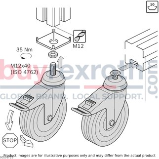 Designed to meet various application needs, this caster wheel can be used as a caster wheel with lock, standard caster, or trestle wheel. To ensure secure attachment to profiles, it requires fastening material such as a screw M12x30 ISO 10642 at 50 Nm torque and potentially a bearing ring if using a cover cap with hole. The product belongs to Productgroup ID and comes in specified packaging units.