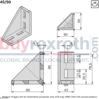 The Bosch Rexroth GUSSET 45X90 SILVER SET (3842551607) is a high-quality connection element designed to facilitate rapid and precise assembly within various structural applications. This bracket set falls under the designLINE product group, known for its special silver paint finish in RAL color, which not only provides an aesthetically pleasing high-quality design but also ensures durability. The gusset features centering lugs that aid in alignment and prevent rotation during installation, with the added convenience of being easily removable for alternative assembly methods, such as attaching to plates or perpendicular to the profile slot. Constructed from die-cast aluminum that has been vibratory ground and painted, the GUSSET 45X90 SILVER SET is both sturdy and visually appealing. It comes equipped with a cover cap available in signal gray (RAL) or black ESD (RAL), which serves to protect against dirt accumulation. The bending moment and torsional moment specifications indicate the bracket's capability to withstand mechanical stresses, making it suitable for robust applications. The dimensions of this bracket are tailored to fit profile slots efficiently, while its white aluminum color (RAL) seamlessly integrates into various design schemes. The set includes fastening material consisting of T-bolts M8 and flange nuts M8, ensuring secure attachment without the need for additional profile finishing. With a weight specification provided, users can account for the bracket's contribution to overall system mass. Overall, the Bosch Rexroth GUSSET 45X90 SILVER SET is an essential component for those requiring reliable and precise connection elements with an added touch of design sophistication. It is particularly suited for constructing frames, supports, or any structure that benefits from enhanced visual appeal without compromising on strength or functionality.