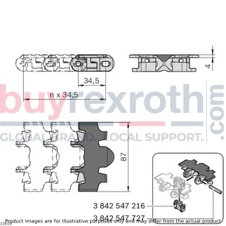 The Bosch Rexroth CONVEYOR CHAIN 90+ FLOCKED L4968 (3842553023) is designed with meticulous attention to detail to cater to the handling of sensitive transport surfaces, such as those with gloss, clear finishes, barcodes, or raised printing. This conveyor chain is part of a specialized product group characterized by its flocked chain VFiplusi feature, which employs soft PA flocking .dtex in an anthracite color to ensure the gentle movement of delicate items. The material construction consists of a POM chain link, non-rusting steel for the chain pin, and PA for the pivot pin.