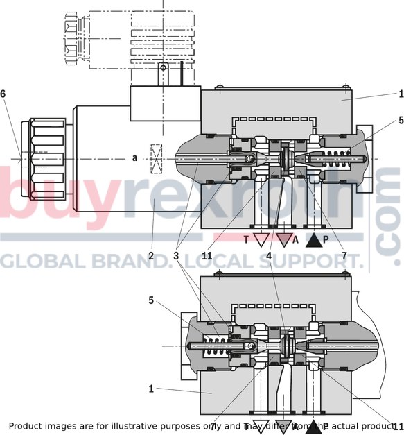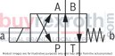 Transition position:Upon actuation of the main valve, the closing element (4) is shifted against the spring (5) and pressed onto the seat (7). During this, port T is blocked, while P, A, and B are briefly connected to each other.