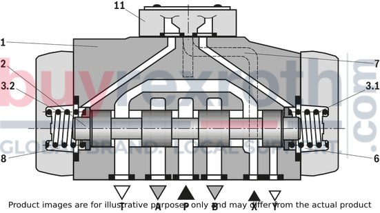 With this version, the main control spool (2) is held in zero position by two return springs (3.1) and (3.2). The two spring chambers (6) and (8) are connected to ports X and Y via the diversion plate (11). With pilot pressure loading of one of the two front sides of the main control spool (2), the spool is moved to the switching position. In the valve, the required ports are connected in this way. The spring on the opposite side returns the spool to the zero or initial position at pressure relief of the pressurized control spool area.