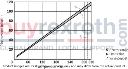 This valve is provided with an additional pre-opening. By pressurization at the X port, the control spool (4) is moved to the right. As a result, the ball (5) is pushed off the seat first and the seat poppet (2) afterwards.