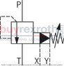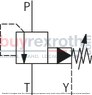 When the pressure at channel P surpasses the preset value on the pilot control valve, it triggers the valve to open, allowing pilot oil to discharge directly into channel Y. This action causes the main spool to move upwards against the springs, creating a connection between channels P and T, which remains as long as the pressure continues to exceed the set value on the pilot control valve.
