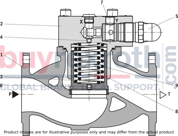 The main spool (3) moves upwards against the springs (8) and (9) and connects channel P to channel T as long as the pressure exceeds the value set at the pilot control valve.