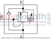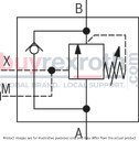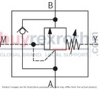 This model features several adjustment types for setting the sequencing pressure, including a rotary knob, a threaded pin with hexagon and protective cap, a lockable rotary knob with scale, and a rotary knob with scale. It also provides an option for monitoring sequencing pressure through a pressure gauge connection. For applications requiring free hydraulic fluid return flow from channel B to channel A, an optional check valve can be installed.
