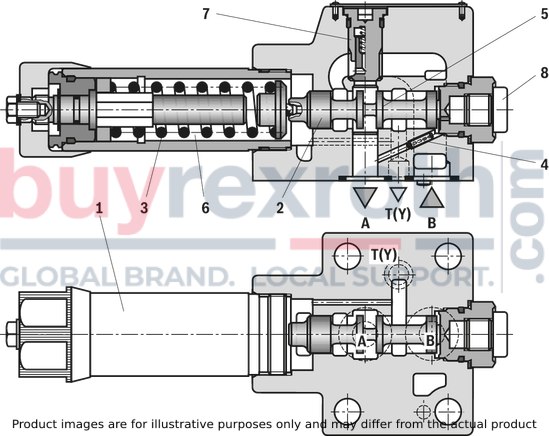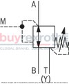 In its initial position, the valve permits unrestricted hydraulic fluid flow from channel B to channel A, while the pressure in channel A is controlled via a control line acting on a piston area against a compression spring. When the preset spring value is exceeded, the control spool activates to maintain a constant pressure level in channel A. The valve features internal signal and pilot oil supply from channel A and has external leakage oil discharge via channel TY.