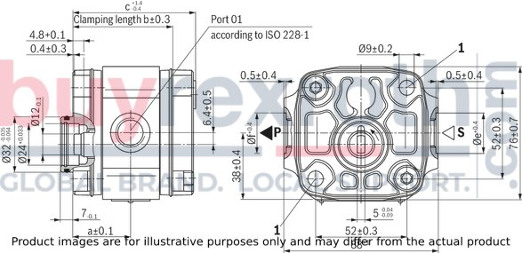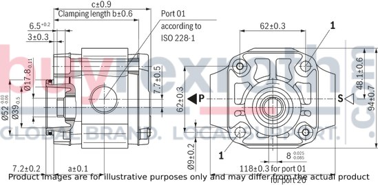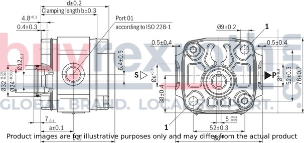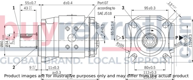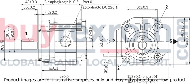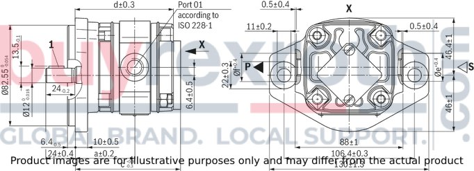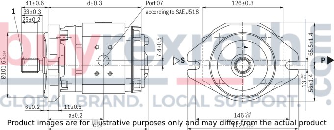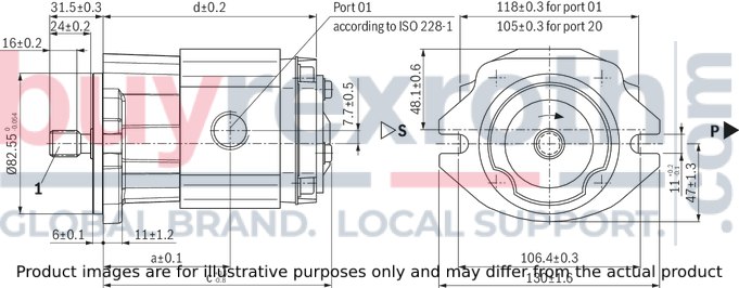 The shaft design of the front pump must be E, J or L. The shaft design of the medium pump must be L. The shaft design of the back pump must be N. If a pump of the next smaller frame size is to be attached, the first pump must have the designation K at the end (e.g. PGF3 + PGF2 ⇒ front pump: PGF3-3X/032RJ07VU2K)Dimensions