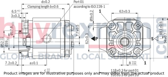The dimensions of the connections correspond to those of single pumps (see Dimensions). The overall length of the pump combination results from the addition of the dimensions “d” of the single pumps (see Dimensions) With the combination of PGF2 and PGF1, the length of the assembly of PGF2 (dimension d) increases by 4.5 mm. With the combination of PGF3 and PGF2, the length of the assembly of PGF3 (dimension d) increases by 2 mm. With the combination of PGF3 and PGF1, the length of the assembly of PGF3 (dimension d) increases by 12.5 mm.