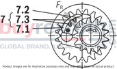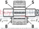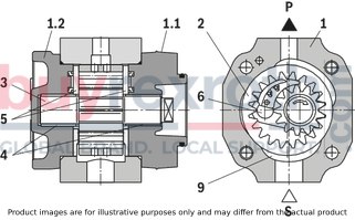 Hydraulic pumps of type PGF are leakage gap-compensated internal gear pumps with constant displacement. They basically comprise of housing (1), bearing cover (1.1), end cover (1.2), internal gear (2), pinion shaft (3), plain bearings (4), axial washers (5) and stop pin (6), as well as the segment filler element (7) consisting of segment (7.1), segment support (7.2) and the seal rolls (7.3).