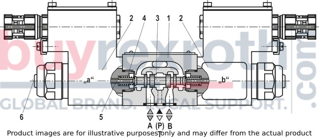 In the de-energized condition, the control spool (3) is held in the central position or in the initial position by the return springs (4) (except for impulse spools). The control spool (3) is actuated by wet-pin solenoids (2).