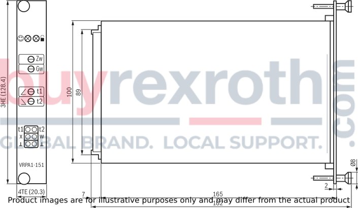 From the output of the ramp generator [3], the command value voltage reaches the "Gw" potentiometer which is accessible through the front plate and serves as attenuator. It can also be used to set the maximum flow of the valve. The downstream limiter [7] limits the command value to 105 % or –5 % (e.g. at excessive command value voltage or by adjustment of the potentiometer for zero point "Zw" and basic value "Gw") to prevent the valve spool from hitting the mechanical end positions. The output signal of the limiter [7] is the position command value which is supplied to the PID controllers [8] and via an output stage [17] also to measuring socket "w" on the front plate of the card as well as to port 28c at the connector strip X1 (command value after ramp and limiter). A voltage of +6 V at command value measuring socket "w" corresponds to a command value of +100 %. The PID controller has been especially optimized for DBETR and FRE valves. In the controller, the position command value and the actual position value are compared; in case of a difference, a corresponding control output is forwarded to the current output stage [13] the output signal of which controls the proportional solenoid of valve.
