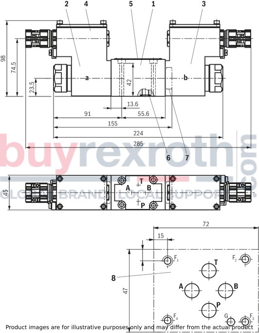 The 4WRA6E15-2X/G24XEJ/V features a robust housing with a connection surface, a control spool balanced by compression springs, and central-threaded solenoids. When in a deenergized state, the control spool maintains its central position due to the springs. Upon energization of one of the solenoids, the control spool shifts proportionally to the electrical input signal, adjusting flow rates between ports P-A and B-T through orifice-type cross-sections with progressive characteristics.