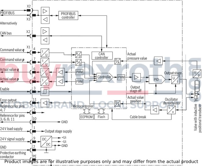 This Bosch Rexroth valve is capable of flow control (Q), pressure control (p), and substitutional control (pQ), with command values presettable either via an analog interface or through a field bus interface. It provides error detection diagnostics for issues such as cable breaks or communication errors and includes additional functions like pressure ramps and internal command value profiles.