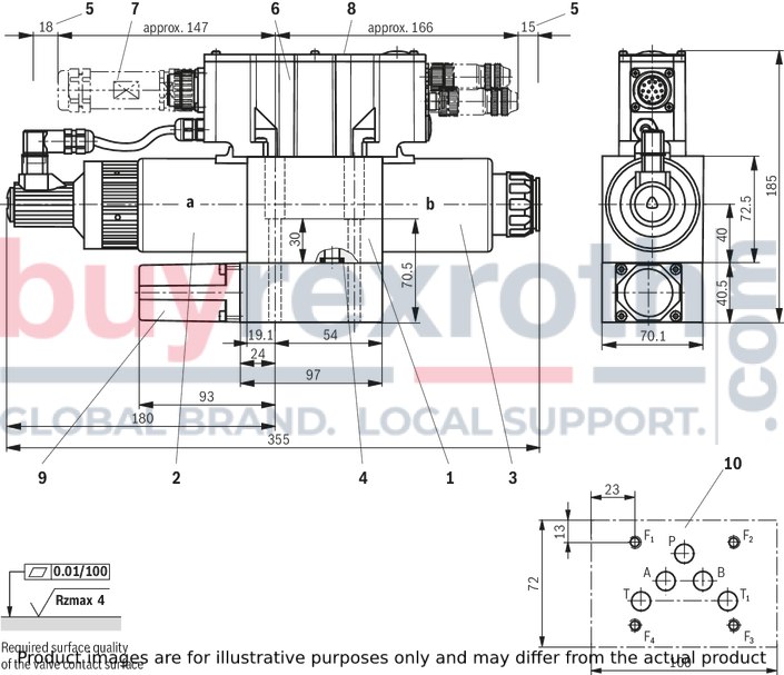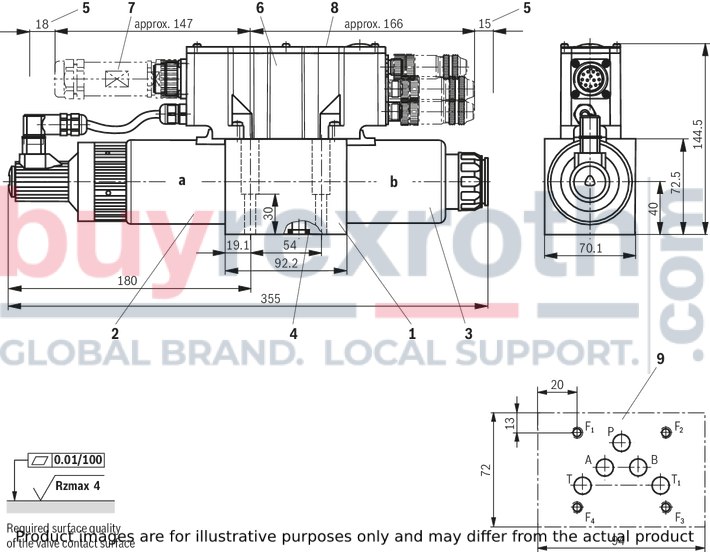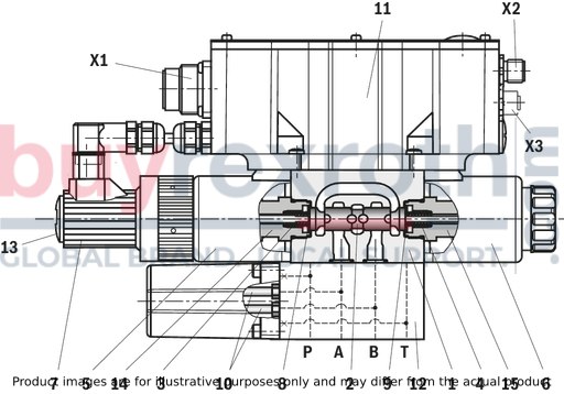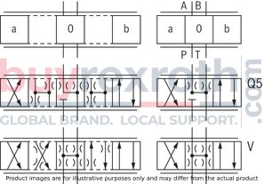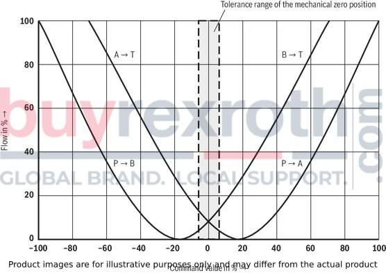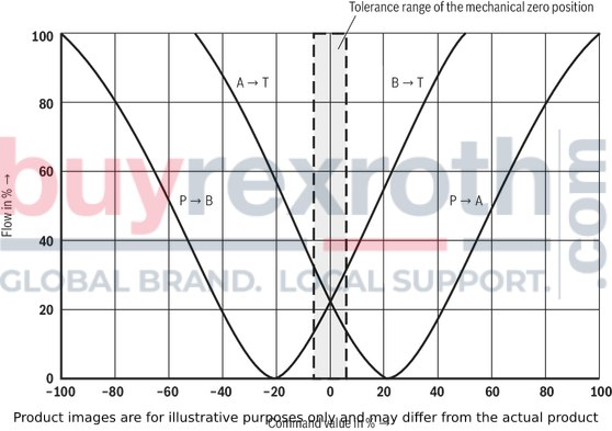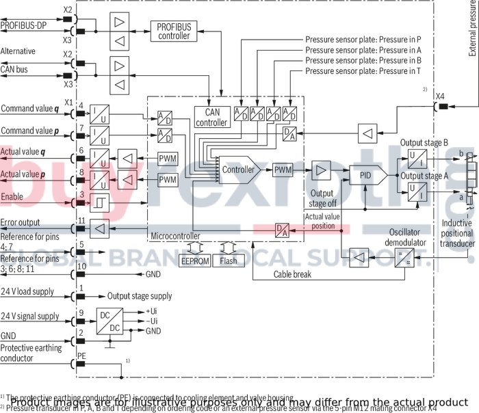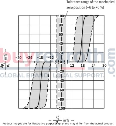 With de-energized solenoids (5 and 6), the control spool (2) is brought into the central position by compression springs (3 and 4) between the spring plates (8 and 9) (with V spool valve without spring plate). With V spool valves, the mechanical zero position does not correspond to the hydraulic one. Depending on the valve type, the following functions result (some of them can be combined): Flow control (Q) Flow control (Q) Pressure control in A and/or B (p) Force control (p) Substitutional control p/Q The command value presetting can alternatively be specified via an analog interface (X1) or via the field bus interface (X2, X3). The actual value signals are provided via an analog interface (X1) and can additionally be read out via the field bus (X2, X3). The controller parameters are set via the field bus Separate supply voltage for bus/controller and power part (output stage) for safety reasonsThe digital integrated control electronics enables the following error detection:
