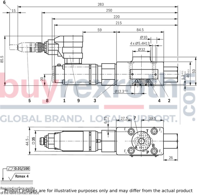 This model is designed for subplate mounting and conforms to ISO porting patterns. It comes equipped with an NBR seal compatible with various hydraulic fluids such as HL, HLP, HLPD, HVLP, HVLPD, and HFC. The electrical connection utilizes a connector pole PE according to DIN EN standards.