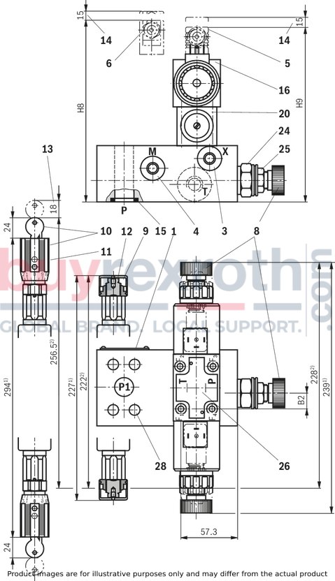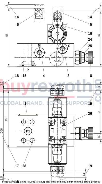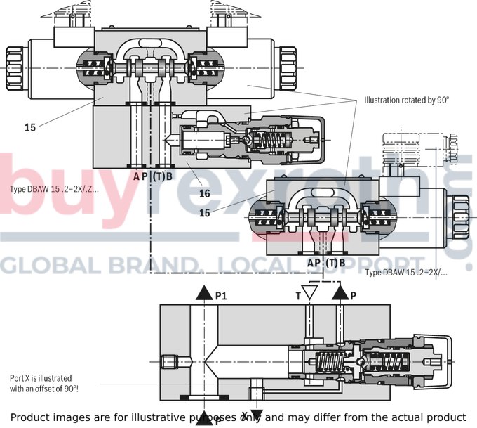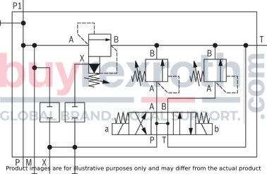 In principle, the function of this block corresponds to the function of block type DBA.... Unloading the main control spool, however, is achieved by controlling the mounted directional valve (15). In this case, no cover plate (4) is required.