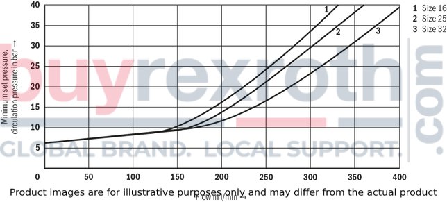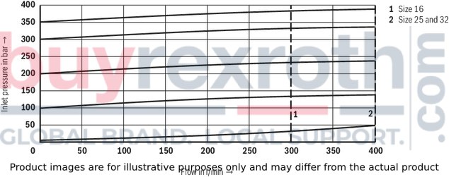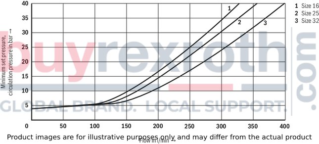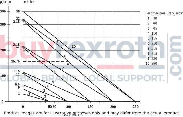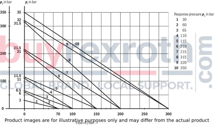 In the plant, the response pressure specified in the component marking is set at a flow of 11 l/min. The maximum admissible flow stated in the component marking applies for applications without counter pressure in the discharge line (port T).Notice!