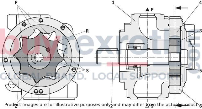 Hydraulic pumps of type PGZ type are gerotor pumps with constant displacement. Via a driving disk, the shaft drives the inner rotor in the indicated direction of rotation. The inner rotor cogs with the gerotor to turn it. The tooth clearances opening in the suction range suck in the hydraulic fluid. The separation of suction and pressure range is implemented on the opposite side of the meshing area by means of a radial gap created by the tooth profile of the outer and the inner rotor sliding against each other. Within the pressure range, the hydraulic fluid is pumped into the pressure port by means of the chambers becoming smaller.