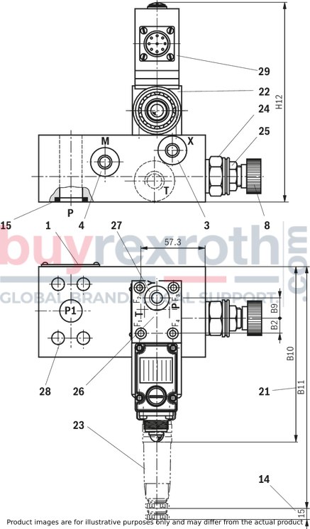 Unloading at the main control spool, however, is achieved by control of the mounted proportional pressure relief valve type DBET(E)-6X/.Y… (17) (data sheet 29162). The cover plate (4) is not required.