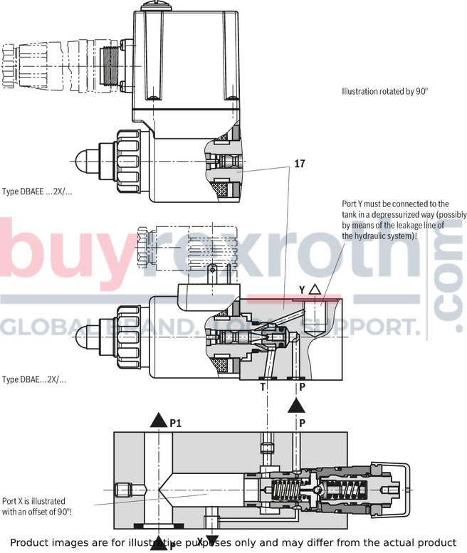 At types DBAE/DBAEE, the lowest adjustable pressure (circulation pressure) is set at the pressure relief valve in case of power failure or cable break. The unloading function (DBAE/DBAEE) must not be used for safety functions!